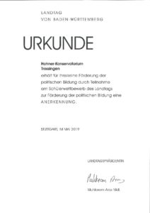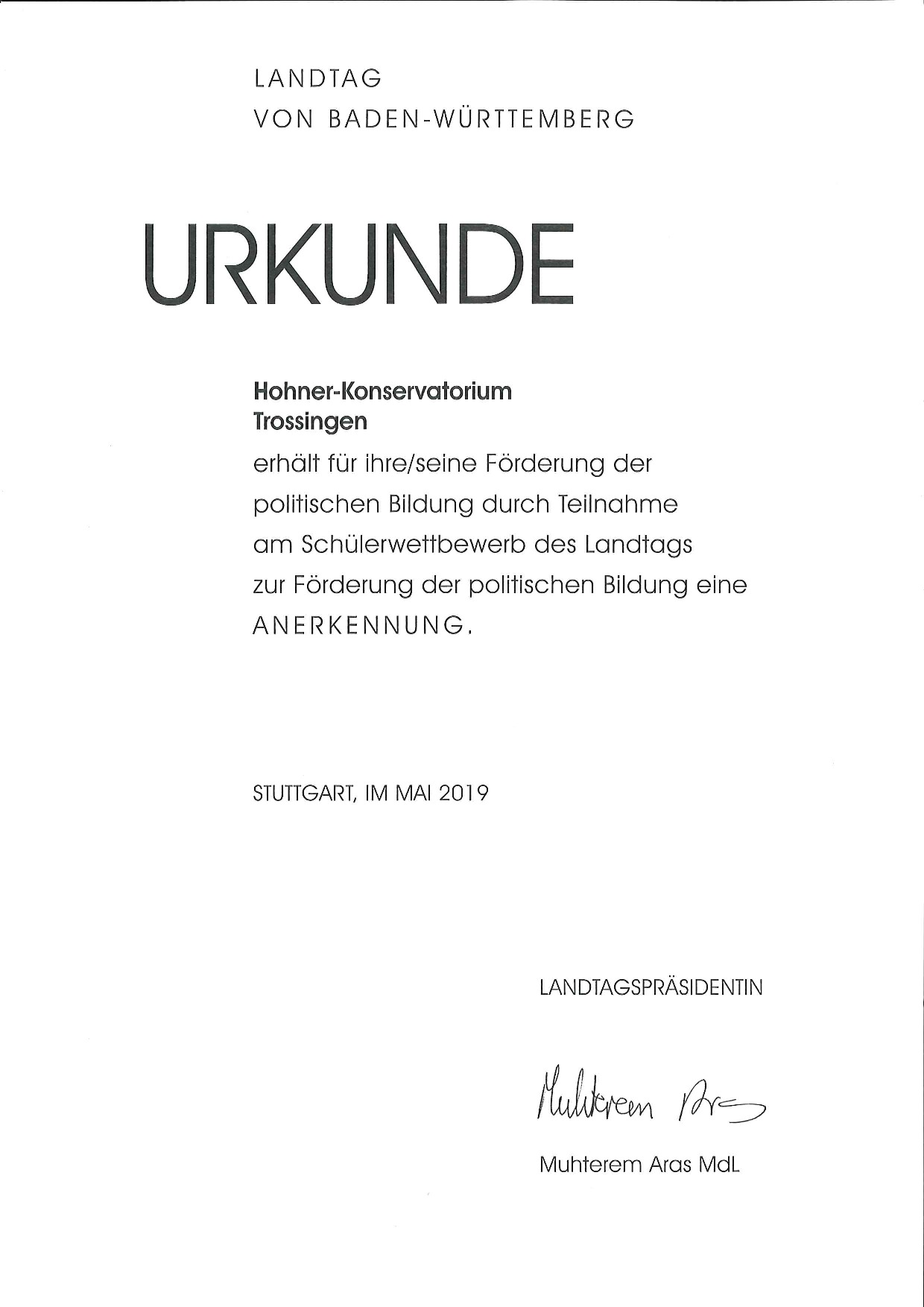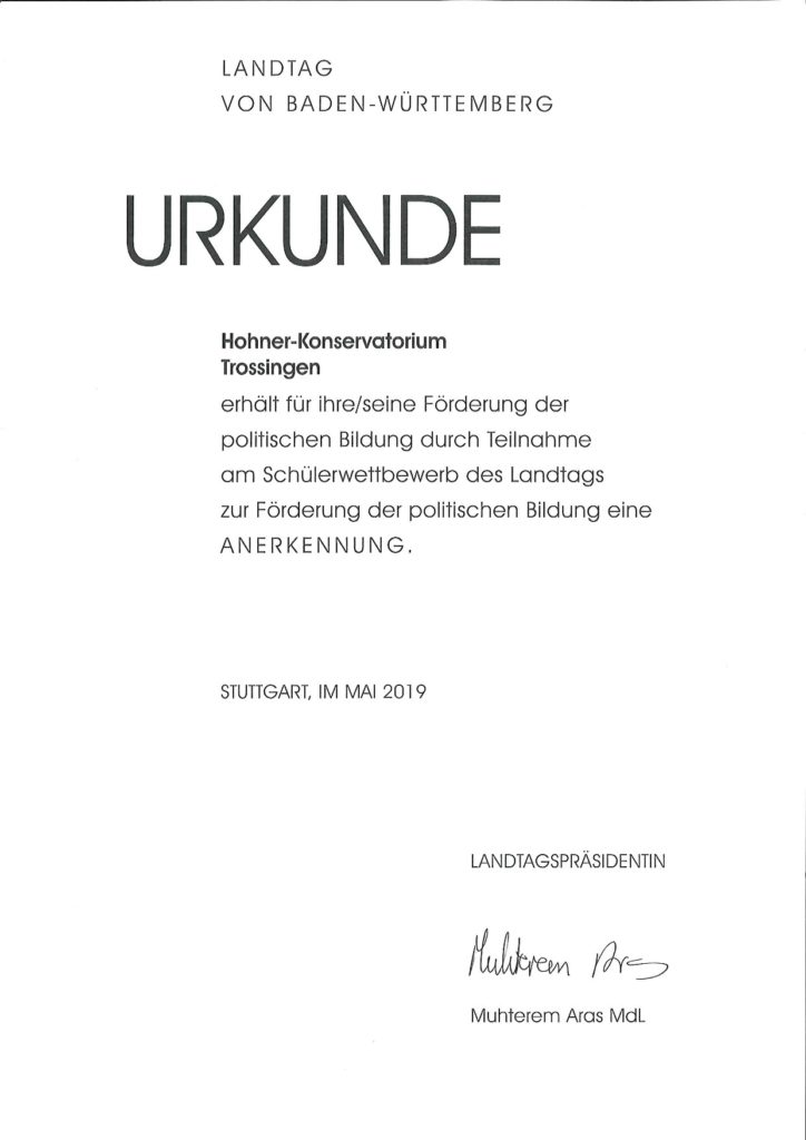 Förderung der politischen Bildung – Preise für Studenten des Hohner-Konservatoriums