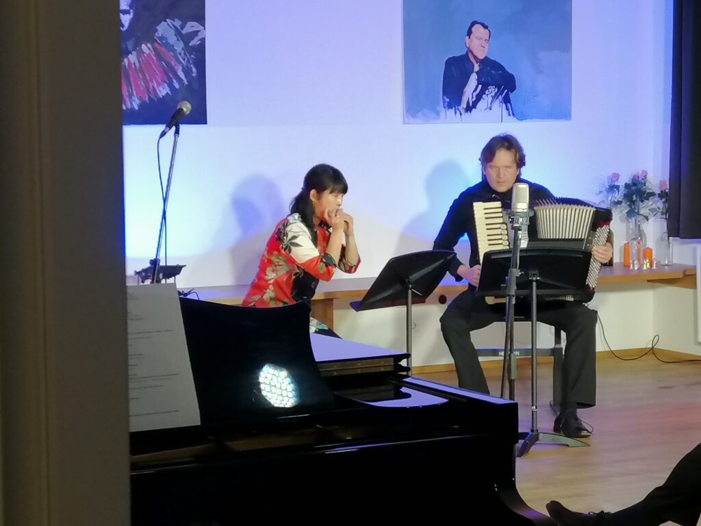 Die Vorfreude auf das erste Stück ist im Raum zu spüren. Das bekannte Musikerpaar Naoko und Andreas Nebl eröffnen das Konzert mit dem Musikstück „Divertimento“ von Mozart. Die ZuschauerInnen erleben eine Symbiose von Akkordeon und Mundharmonika und mit dem Ausklingen des letzten Tones wirkt das Stück im Konzertraum noch nach. Die musikalische Spannung im Raum klingt langsam ab – das Konzert ist eröffnet.