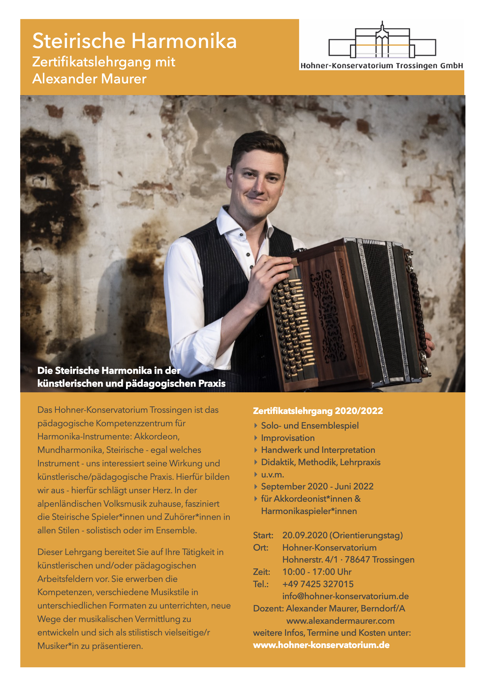 Ab Herbst 2020 wird Alexander Maurer die Ausbildung für Steirische Harmonika am Hohner-Konservatorium leiten. Wir freuen uns auf die Zusammenarbeit!